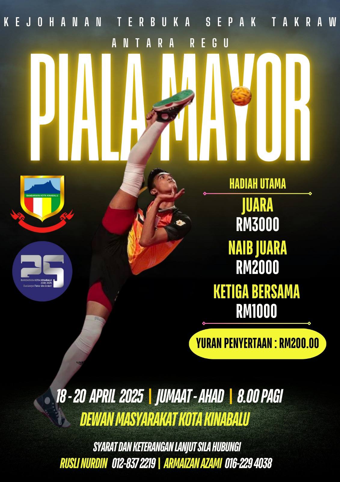 Dewan Bandaraya Kota Kinabalu (DBKK) akan menganjurkan Kejohanan Terbuka Sepak Takraw Antara Regu Piala Mayor bersempena dengan Sambutan Ulang Tahun Ke-25 Jubli Perak Bandaraya Kota Kinabalu, bertempat di Dewan Masyarakat Kota Kinabalu, pada 18 hingga 20 April 2025.