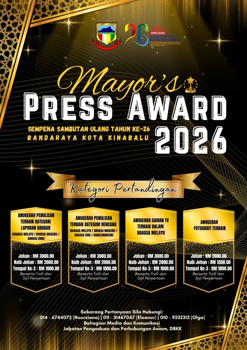 Semua pengamal media yang berdaftar dengan Jabatan Penerangan Sabah dijemput untuk menyertai Mayor's Press Award 2026 yang diadakan sempena Sambutan Ulang Tahun Ke-26 Bandaraya Kota Kinabalu.