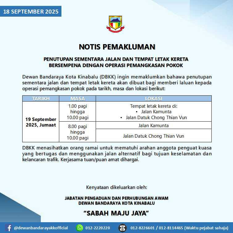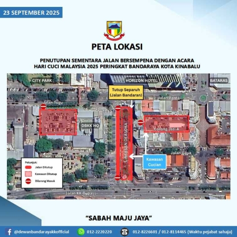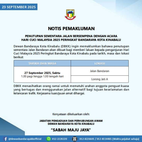 NOTIS PEMAKLUMAN PENUTUPAN SEMENTARA JALAN BERSEMPENA DENGAN ACARA HARI CUCI MALAYSIA 2025 PERINGKAT BANDARAYA KOTA KINABALU