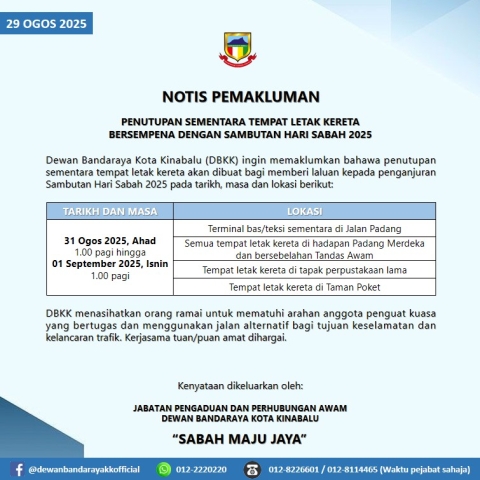 NOTIS PEMAKLUMAN PENUTUPAN SEMENTARA TEMPAT LETAK KERETA BERSEMPENA DENGAN SAMBUTAN HARI SABAH 2025