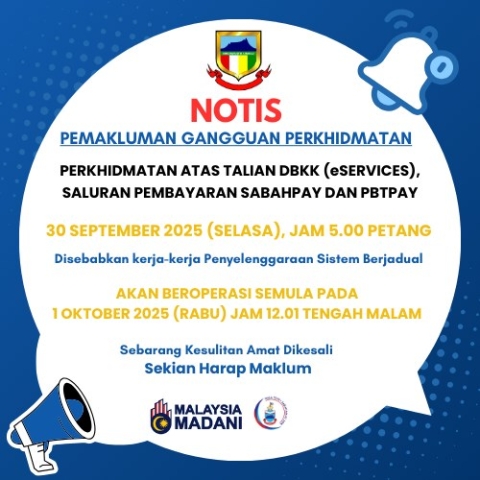 NOTIS PEMAKLUMAN GANGGUAN PERKHIDMATAN ATAS TALIAN DBKK (eSERVICES), SALURAN PEMBAYARAN SABAHPAY DAN PBTPAY PADA 30 SEPTEMBER 2025