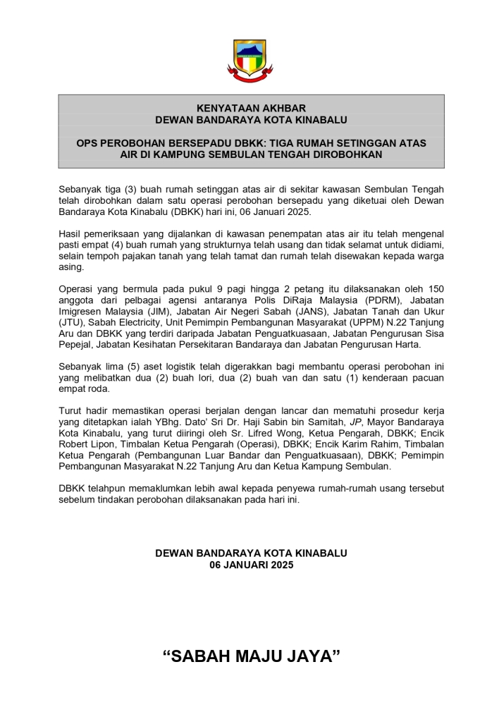 Berita: OPS Pencerobohan Bersepadu DBKK: Tiga Rumah Setinggan Atas Air Di Kampung Sembulan Tengah Dirobohkan