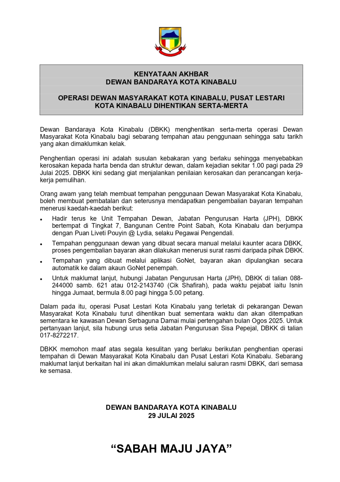 KENYATAAN AKHBAR DBKK - OPERASI DEWAN MASYARAKAT KOTA KINABALU, PUSAT LESTARI KOTA KINABALU DIHENTIKAN SERTA-MERTA