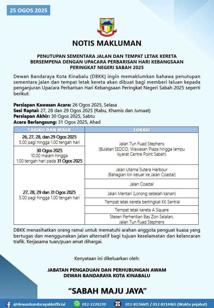 NOTIS MAKLUMAN PENUTUPAN SEMENTARA JALAN DAN TEMPAT LETAK KERETA BERSEMPENA DENGAN UPACARA PERBARISAN HARI KEBANGSAAN PERINGKAT NEGERI SABAH 2025