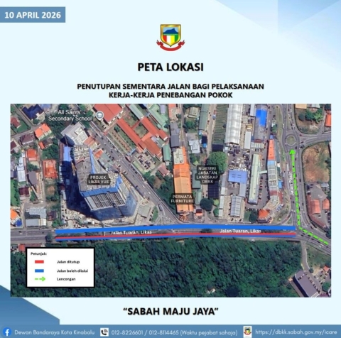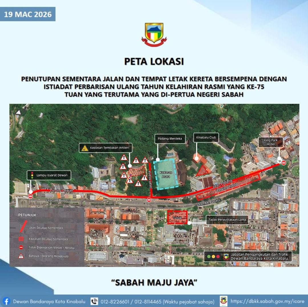 PERINGATAN MESRA: NOTIS PEMAKLUMAN PENUTUPAN SEMENTARA JALAN DAN TEMPAT LETAK KERETA BERSEMPENA DENGAN ISTIADAT PERBARISAN ULANG TAHUN KELAHIRAN RASMI YANG KE-75 TUAN YANG TERUTAMA YANG DI-PERTUA NEGERI SABAH